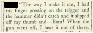 Soon he was engaged in a series of stick-ups with a partner, then, after a sojourn at the Elmira Reformatory (having been apprehended), he jumped parole, and resumed robbery. Although he used a pistol in his crimes, he never resorted to violence. Acknowledging that he was a stick-up man, he denied being a killer. He told Croswell Bowen, the author of the New Yorker articles, about an earlier confrontation: